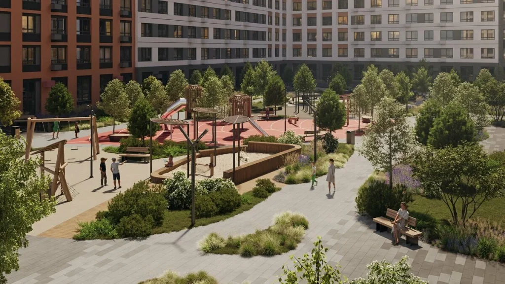 Также во дворах реализована концепция двор без машин, что повышает безопасность и комфорт для жителей.