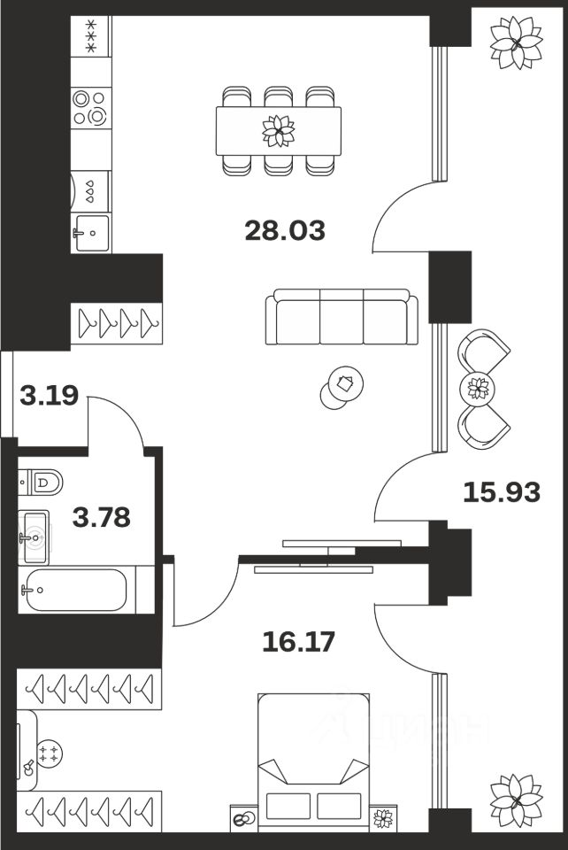 Площадь — от 62 м². Просторные кухни-гостиные и отдельные спальни.