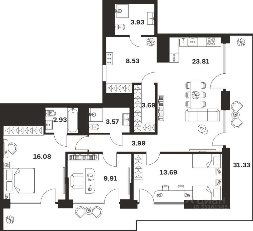 Площадь — от 89 м². Планировки с несколькими спальнями и большими окнами.