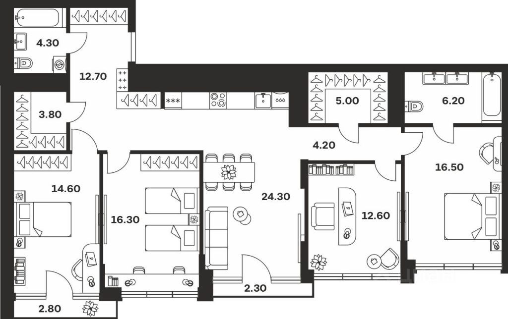 Площадь до 125 м², с несколькими спальнями и большими окнами.