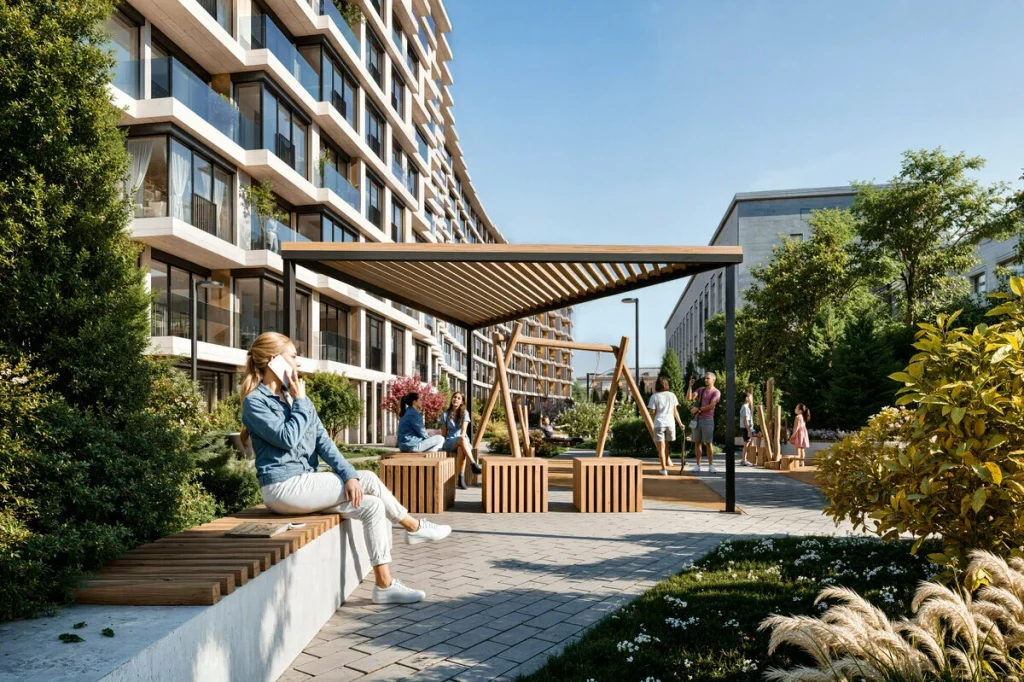 Во дворе предусмотрены детские и спортивные площадки, а также зоны отдыха для жителей.