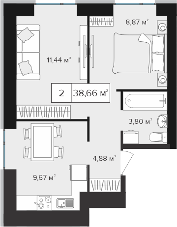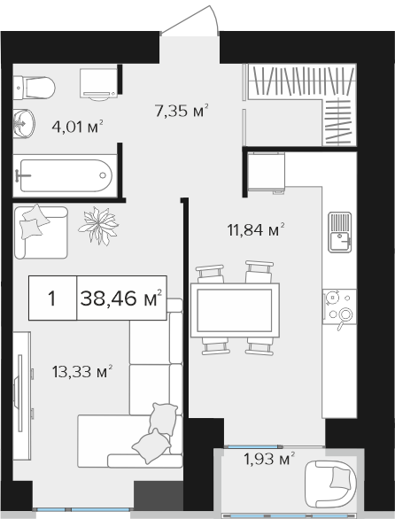 1-комнатные от 33,07 м²